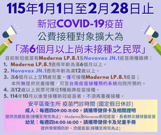 115年1月起 安平區衛生所成人流感及新冠疫苗接種時間:
